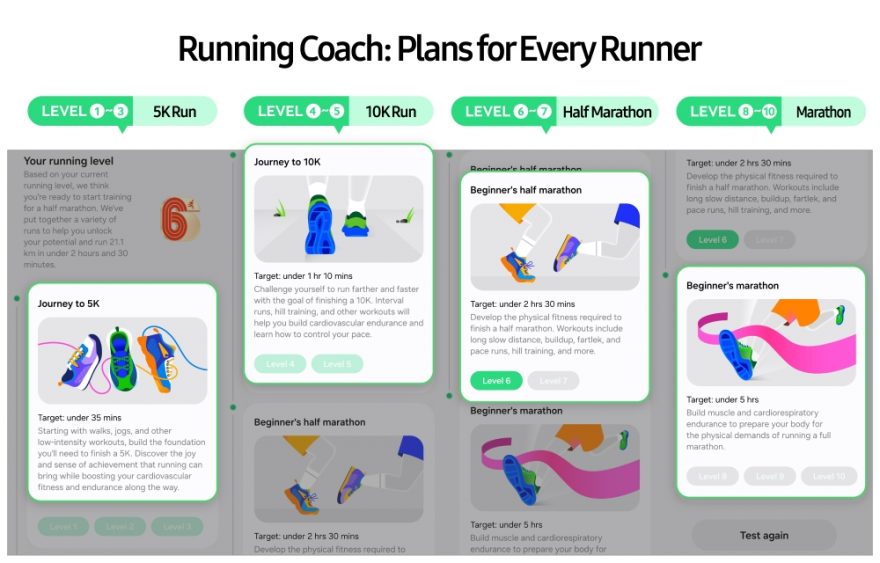 Running Coach offers 15 to 19 customized sessions at each level. The plans call for three to four runs per week with recovery built in, making it easier to maintain a steady routine. After completing over 70% of a program, runners can test into the next level or retake the level test to update their training.